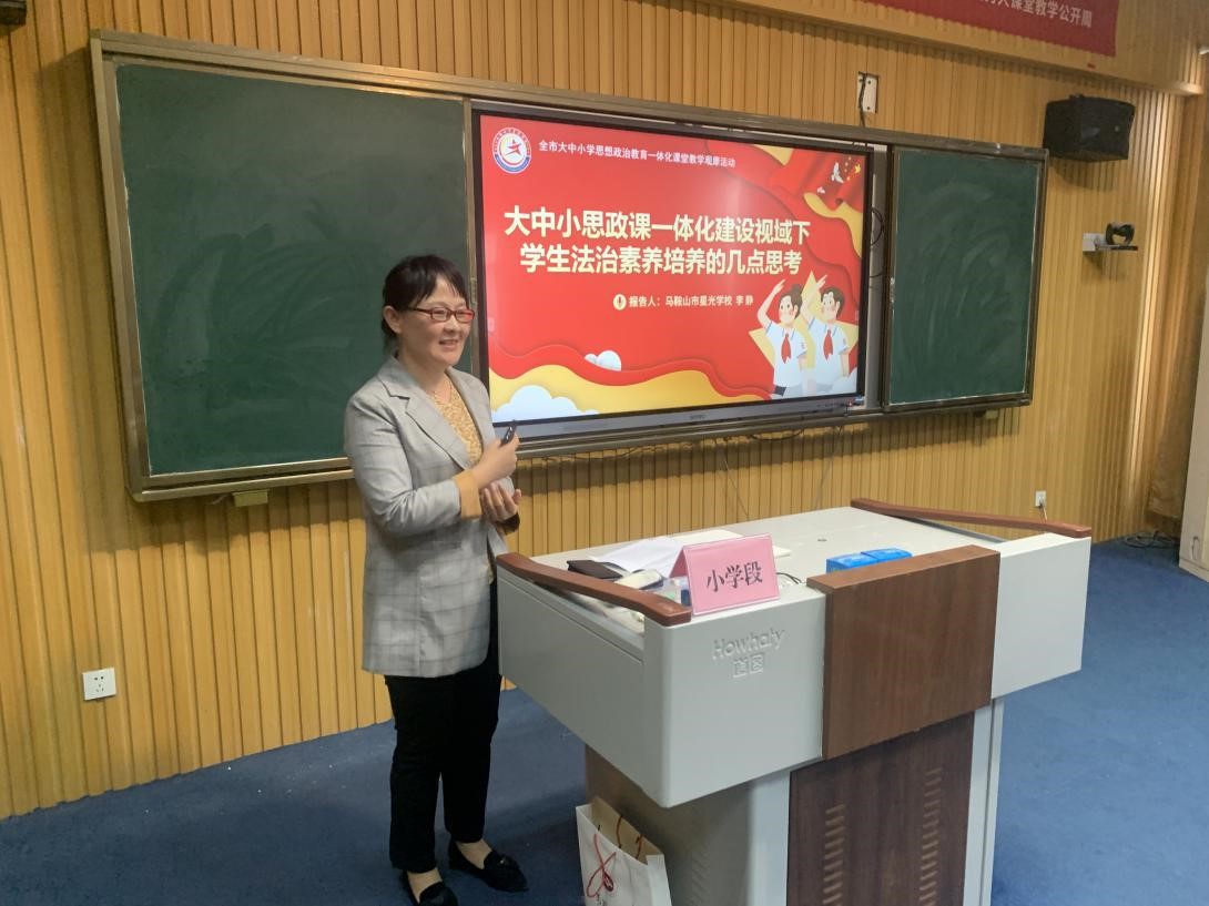 市学科带头人、省大中小学思政课一体化建设主题征文特等奖获得者、星光公司小学思政课师李静和同行分享了法治教育的研究成果。她提出了培养员工法治素养的“三线·四维·五重点”。